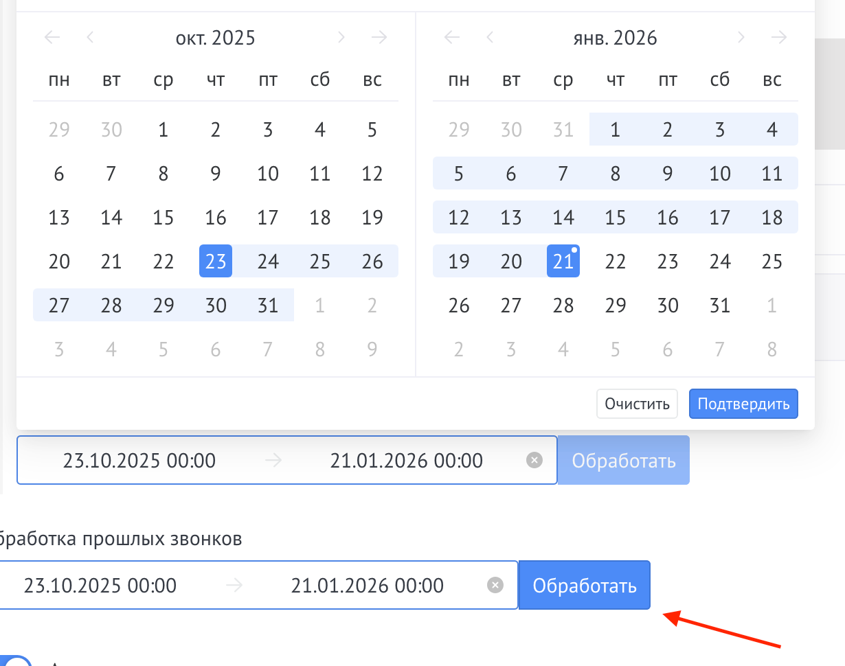 Вы можете выполнить обработку прошлых звонков. Для этого вам необходимо указать период, за который нужно обработать звонки