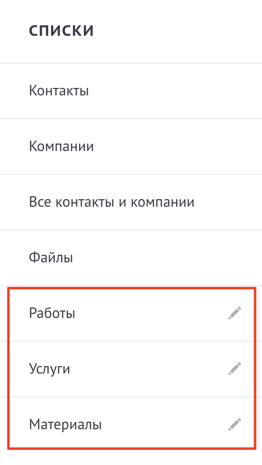 После установки виджета в раздел Списки добавиться три списка Услуга, Работы, Материалы в которые необходимо заполнить ваши данные.