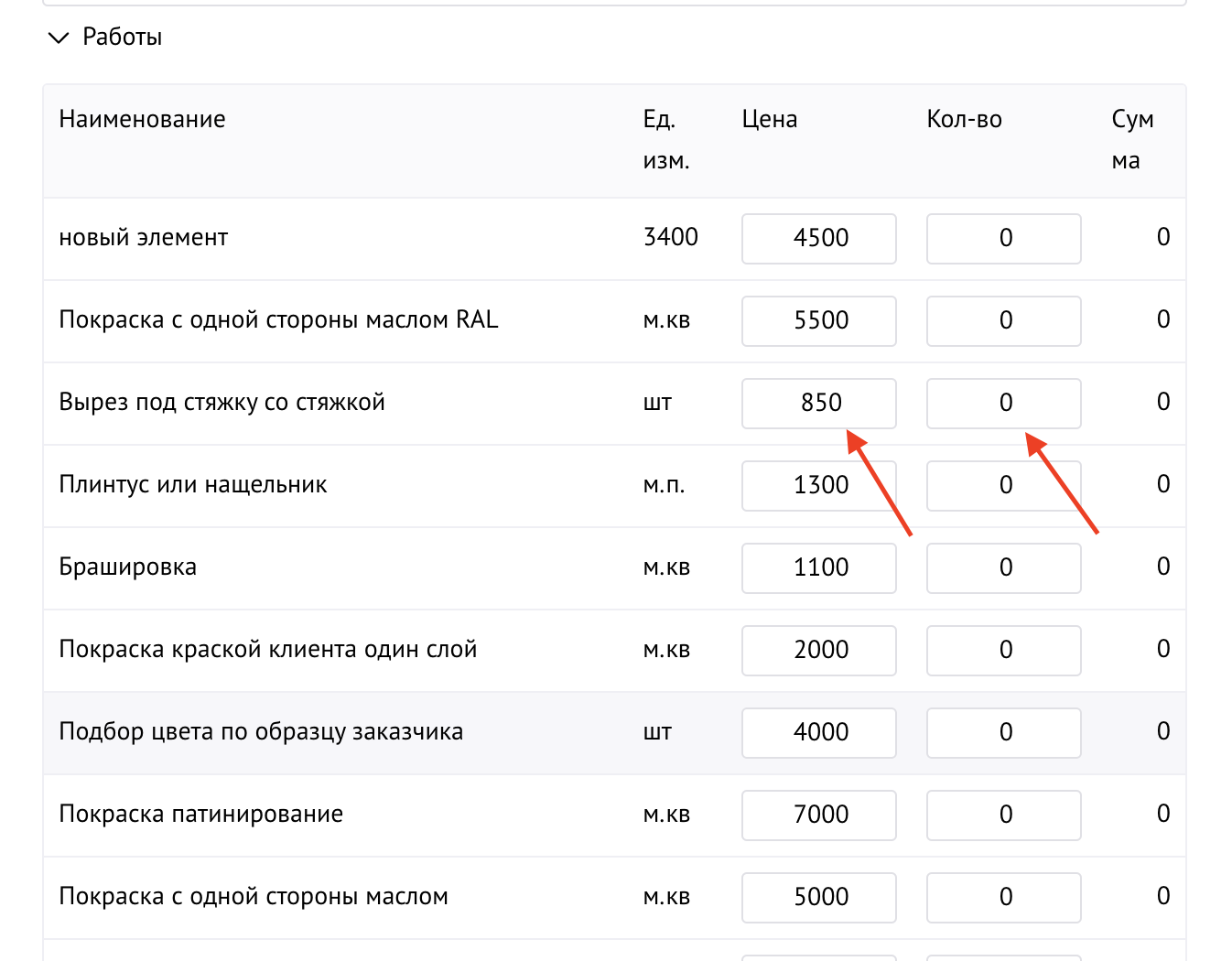 Для добавления работ/услуг/материалов перейдите в список и добавьте элементы в него.