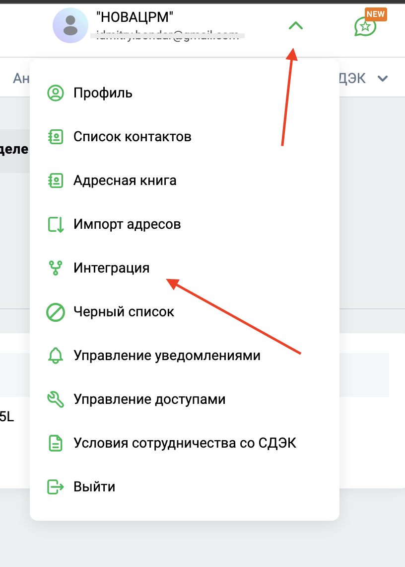 Необходимо перейти в личный кабинет СДЭК, кликнуть на выпадающий список и нажать на Интеграция