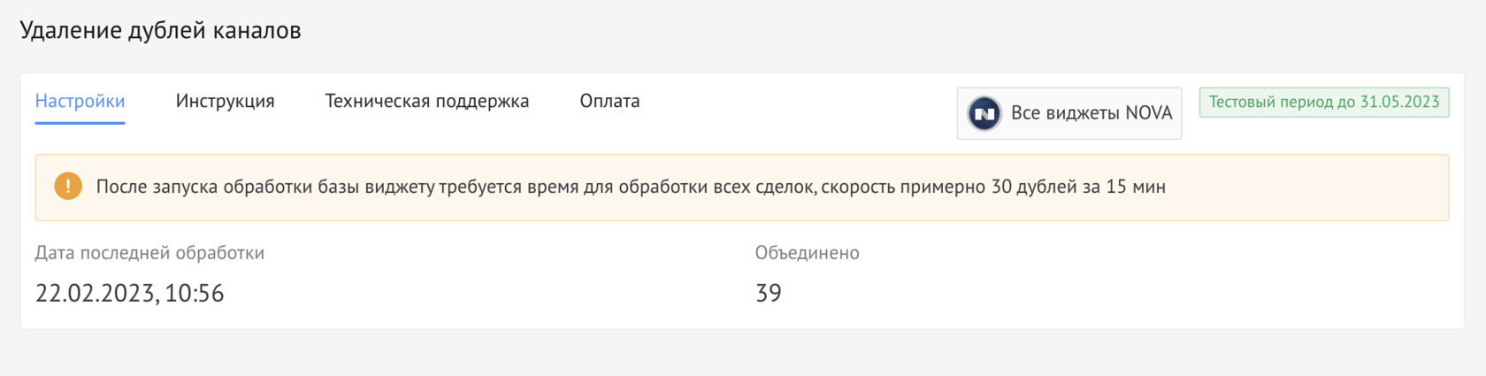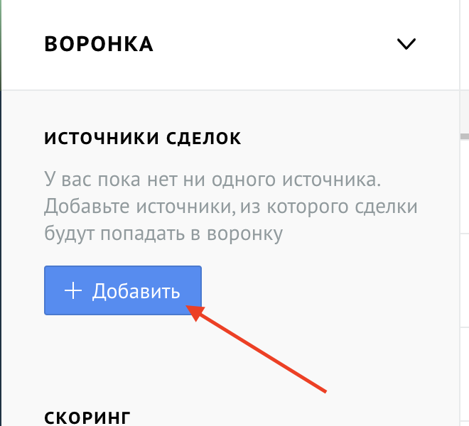 Виджет не требует настройки. Как только появляется дубль канала (чата) он его удаляет.Для проверки необходимо добавить Источник сделок. Для этого нужно перейти в настройки воронки и нажать на Добавить