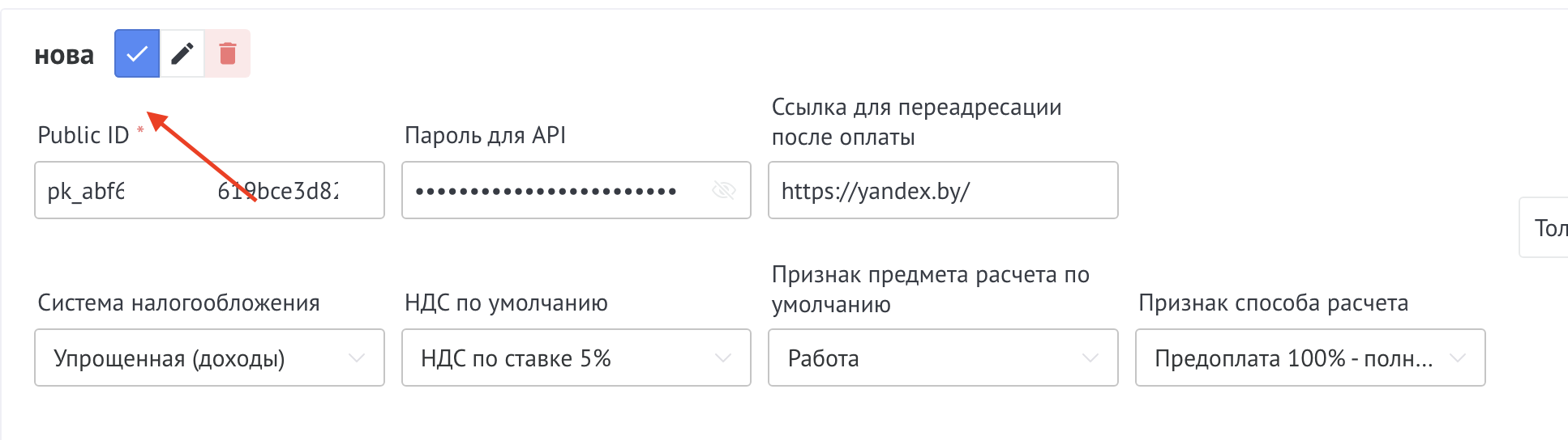 Далее заполнить поля Public ID и Пароль для API это два обязательных поля, остальные поля заполняются при необходимости