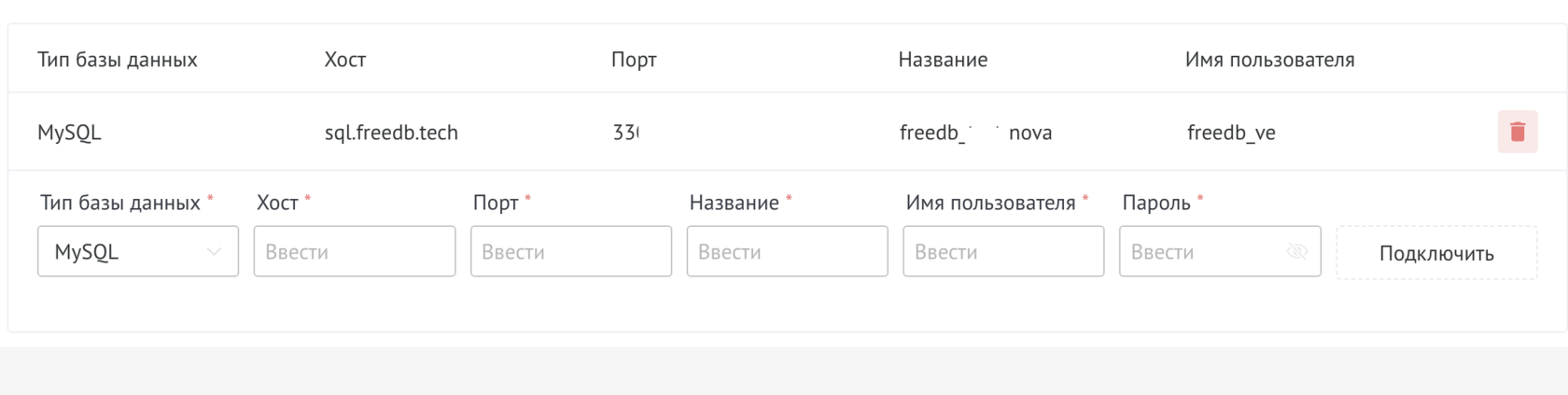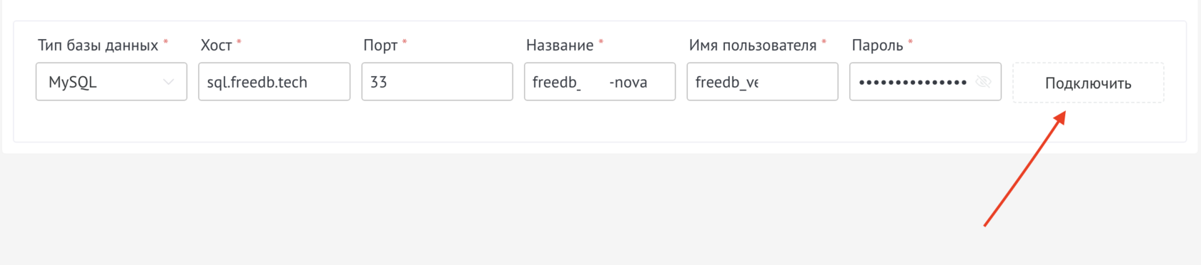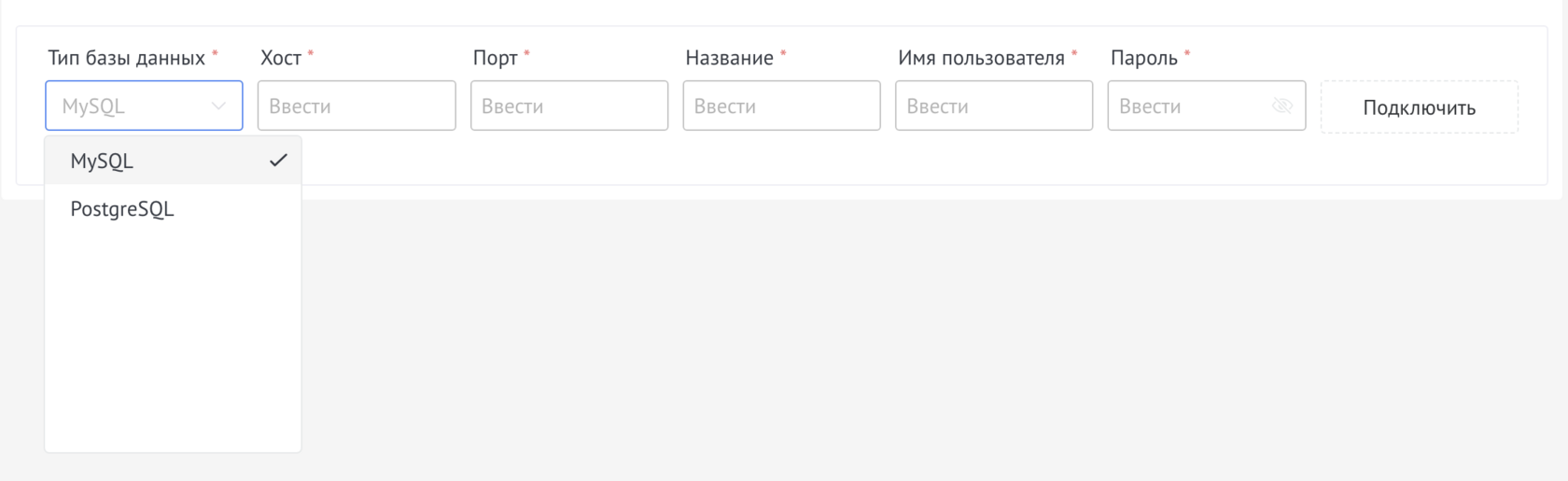 2. Ввести Хост, Порт, Название базы, Имя пользователя и Пароль