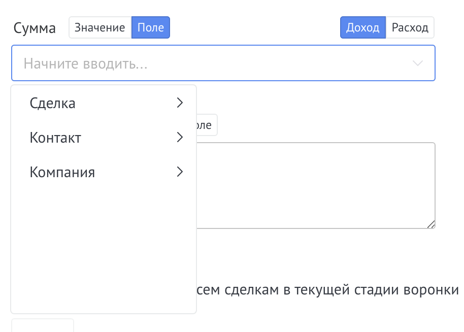 Для добавления расходов/поступлений необходимо перейти в сделку на вкладку Финансовый учет