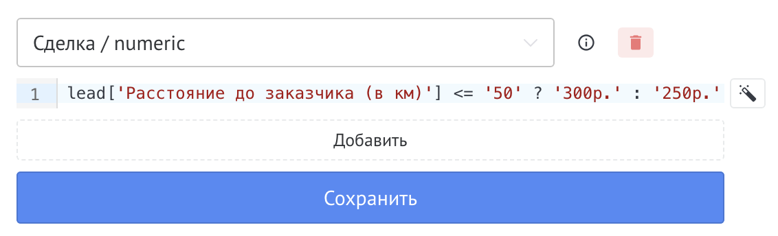 lead['Расстояние до заказчика (в км)'] <= '50' ? '300р.' : '250р.'