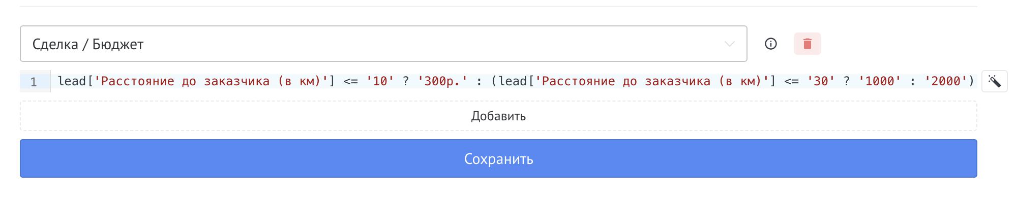 lead['Расстояние до заказчика (в км)'] <= '10' ? '300р.' : (lead['Расстояние до заказчика (в км)'] <= '30' ? '1000' : '2000')