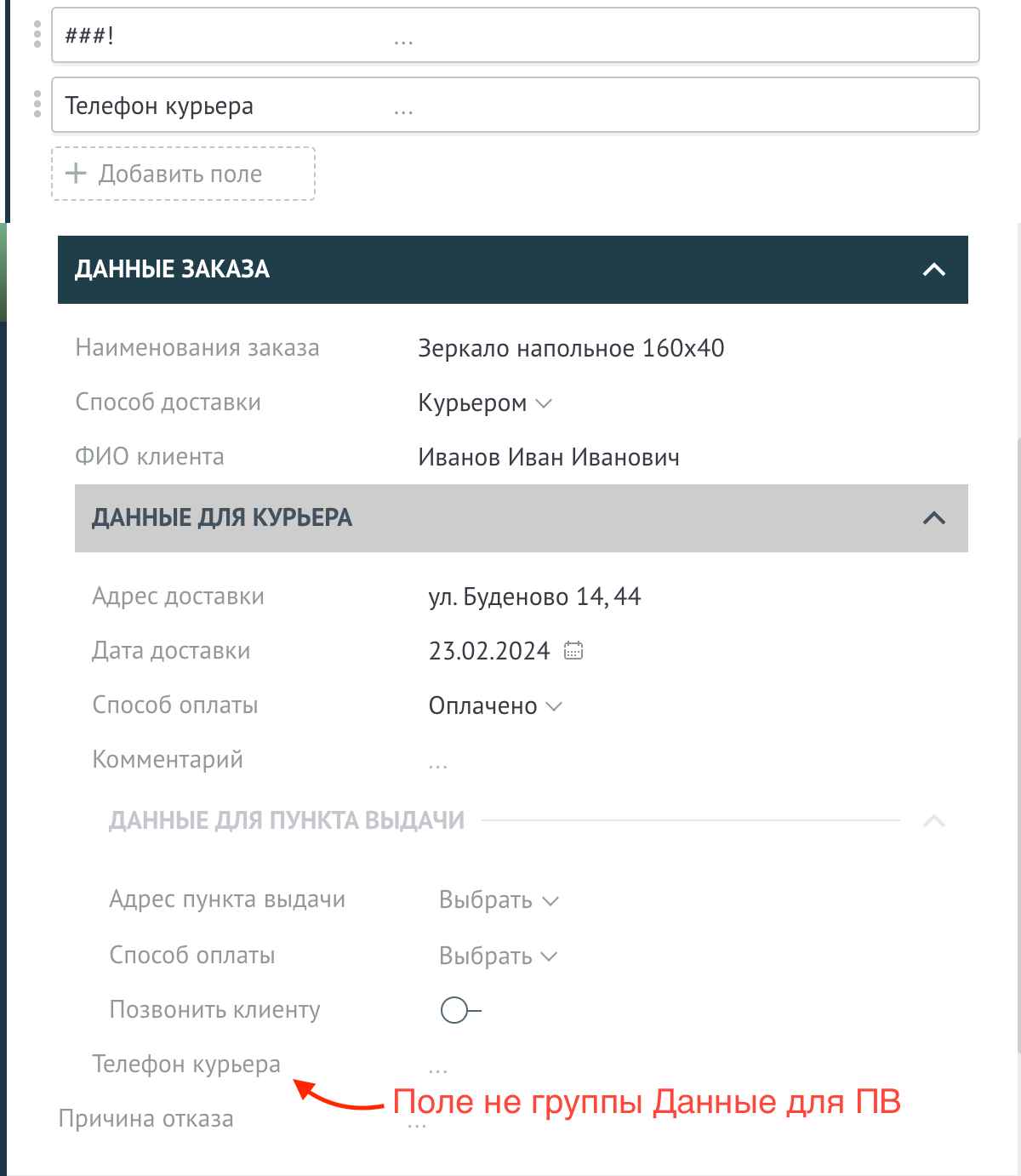 Для того чтобы создать группу необходимо в названии поля добавить две звездочки * в начале названия и в конце. Например: *Данные заказа*