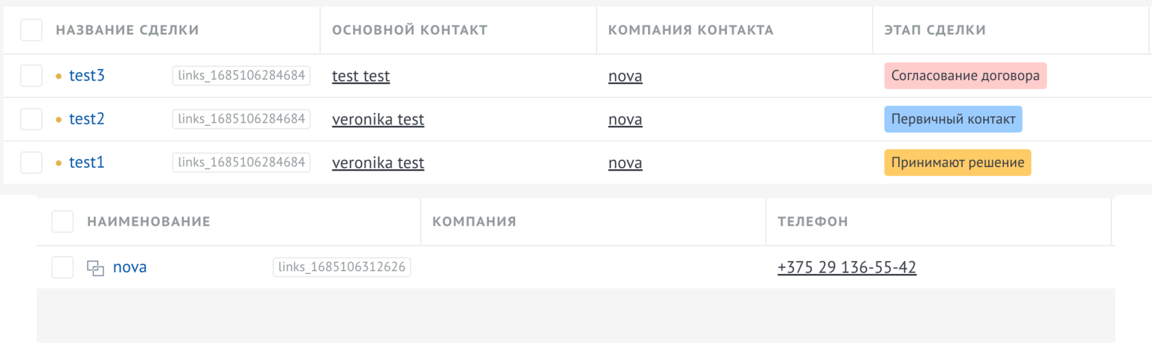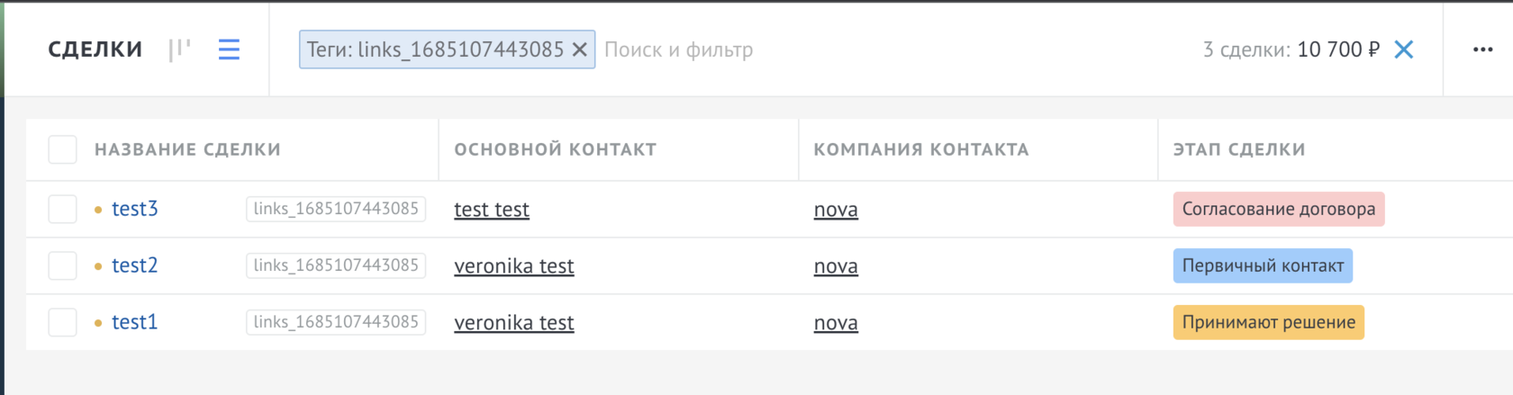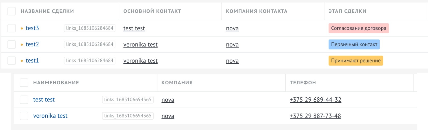 В зависимости от выбранной сущности отобразятся связанные контакты/компании с этими сделками