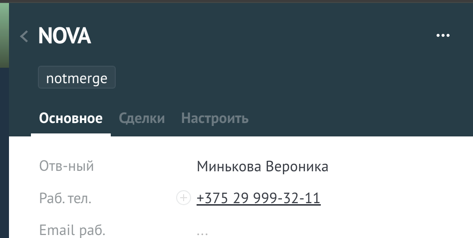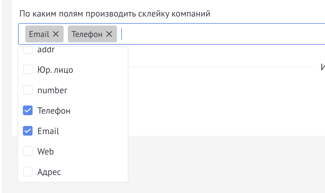 Важно: объединение произойдёт, если совпадает хотя бы одно из выбранных полей. Пример: если указаны номер и email, и у компаний совпадает только номер, то они будут объединены. В итоговой карточке сохранится один номер и оба email.