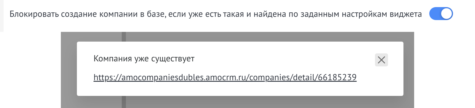 Включите опцию «Блокировать создание компании…» — при попытке создать дубликат система предупредит и даст ссылку на уже существующую компанию.