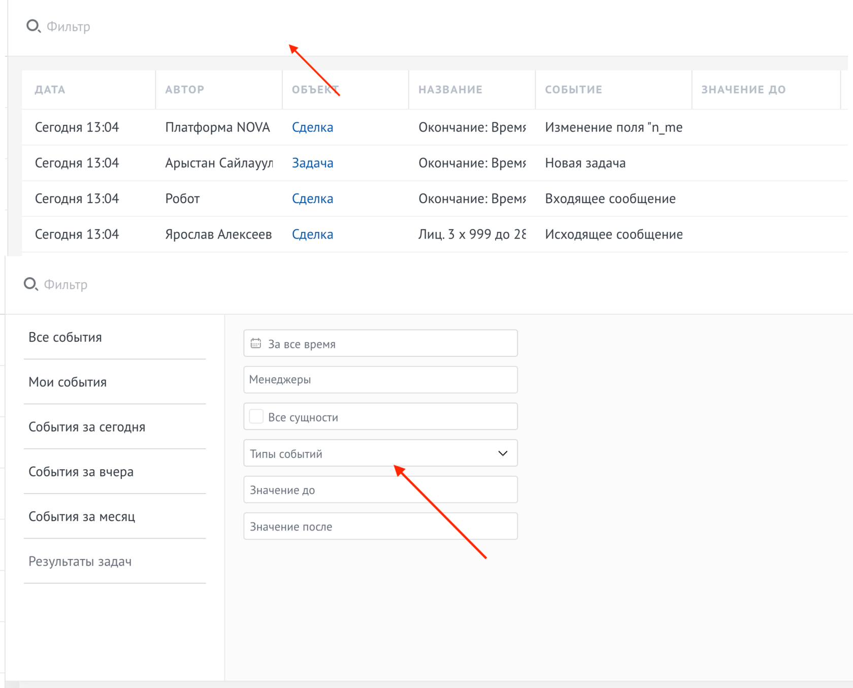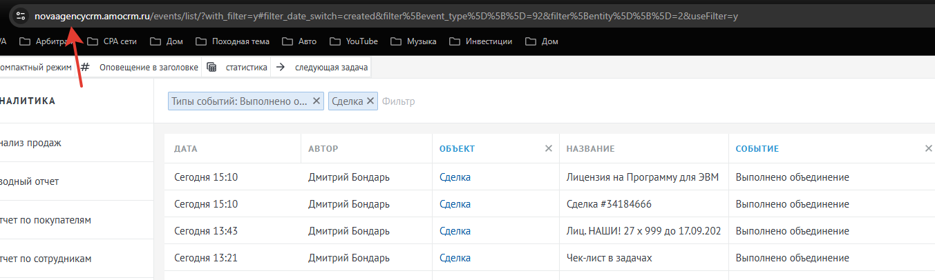 https://xxxxxx.amocrm.ru/events/list/?with_filter=y#filter_date_switch=created&filter%5Bevent_type%5D%5B%5D=92&filter%5Bentity%5D%5B%5D=2&useFilter=y -где вместо xxxxxx ваш субдомен