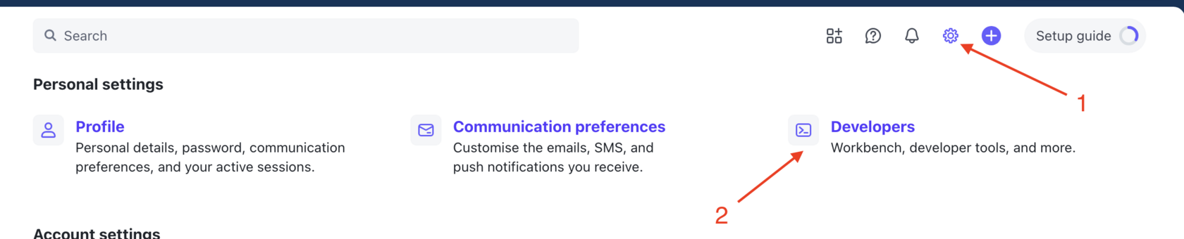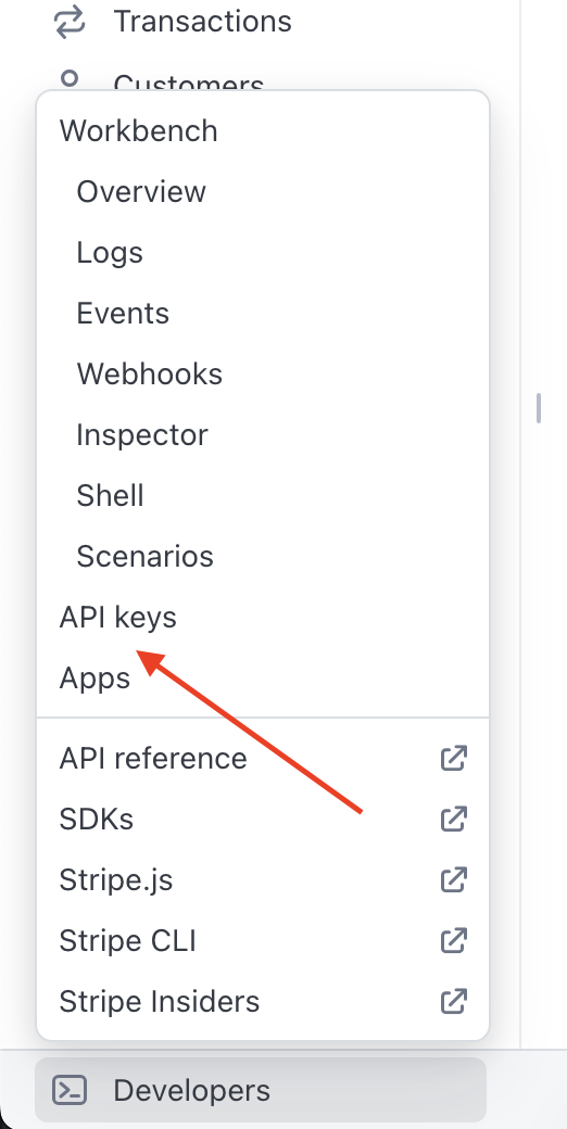 Для начала вам необходимо зайти личный кабинет Stripe и перейти в Developers