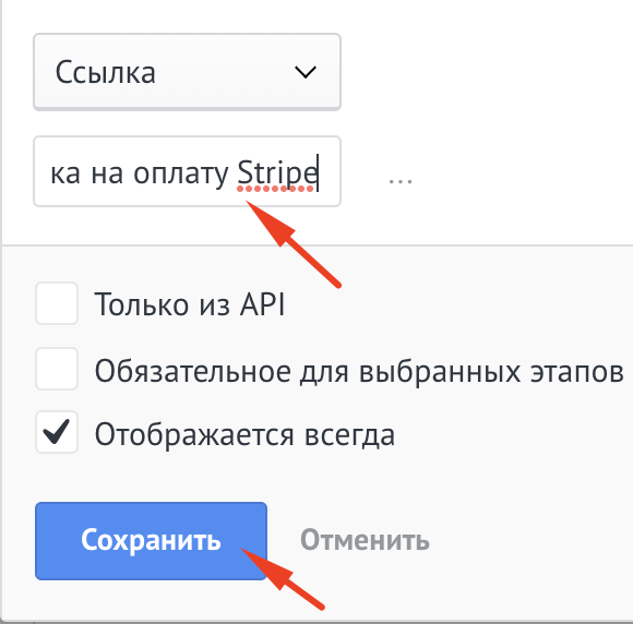 3. В выпадающем поле выбрать Ссылка, ввести Ссылка на оплату Stripe, нажать Сохранить