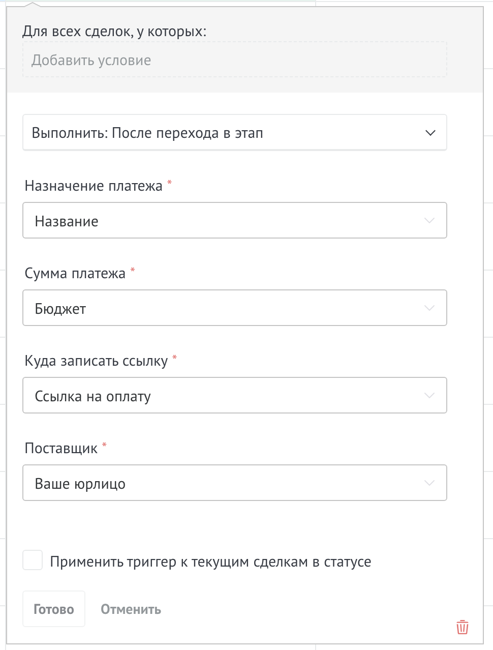 При срабатывании триггера в сделке создаётся счёт, ссылка на оплату данного счёта подставится в выбранное вами поле.
