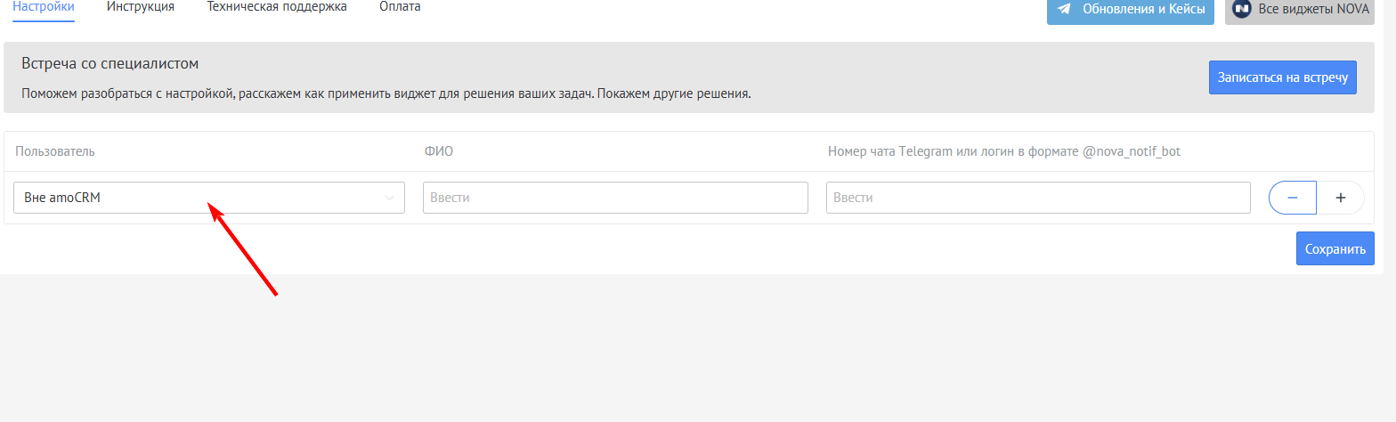 Если нужно добавить человека, которого нет в amoCRM — в поле «Пользователь» выберите Вне amoCRM.