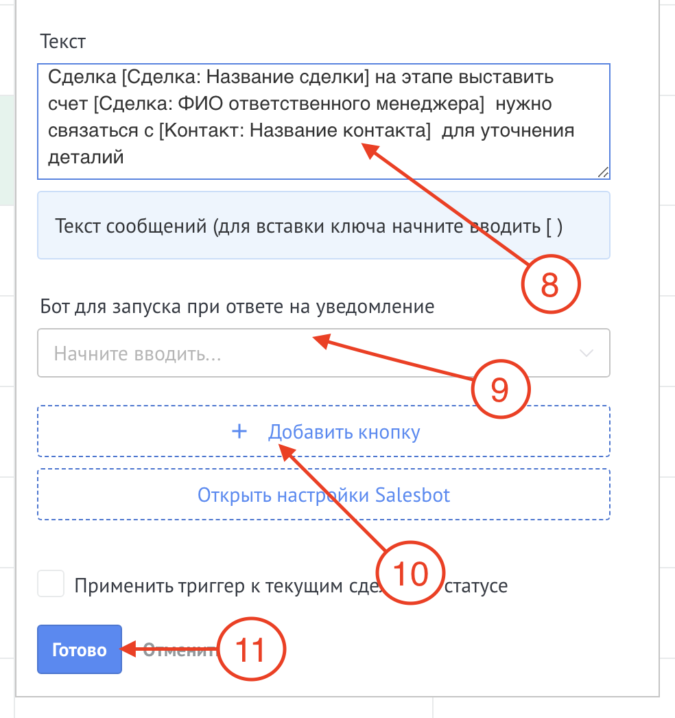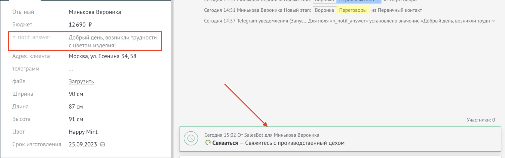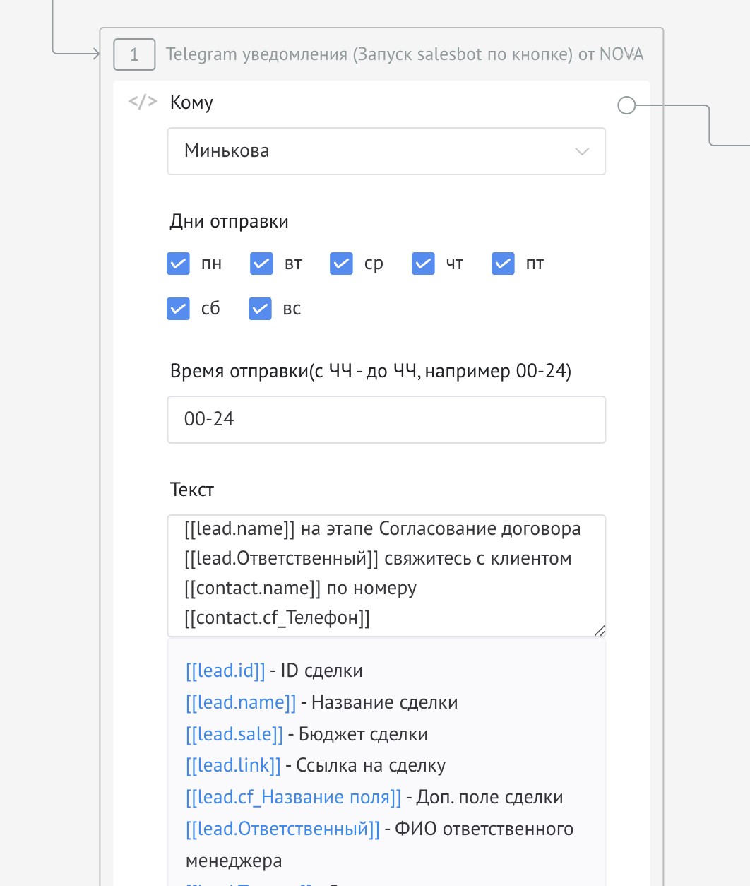 Иногда нужно, чтобы ответ на уведомление в Telegram автоматически запускал действие в amoCRM. Например:1.Для начала настройте Salesbot