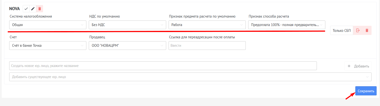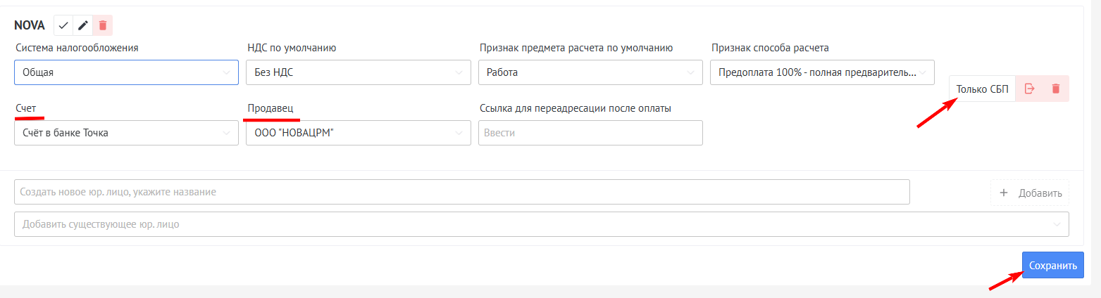 Для получения оплаты Только СБП вам необходимо, нажать на кнопку "Только СБП" заполнить поля Сайт и Продавец значениями из списка, после чего сохранить настройки.