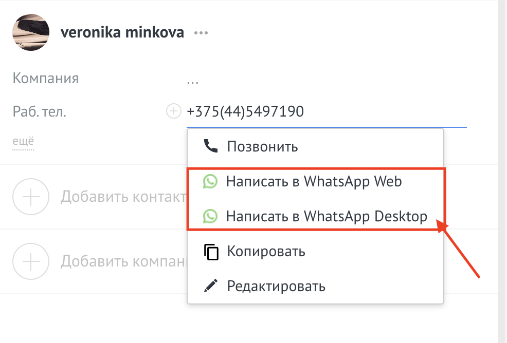 После установки виджета в сделке появится кнопки "Написать в WhatsApp Web" и "Написать в WhatsApp Desktop"