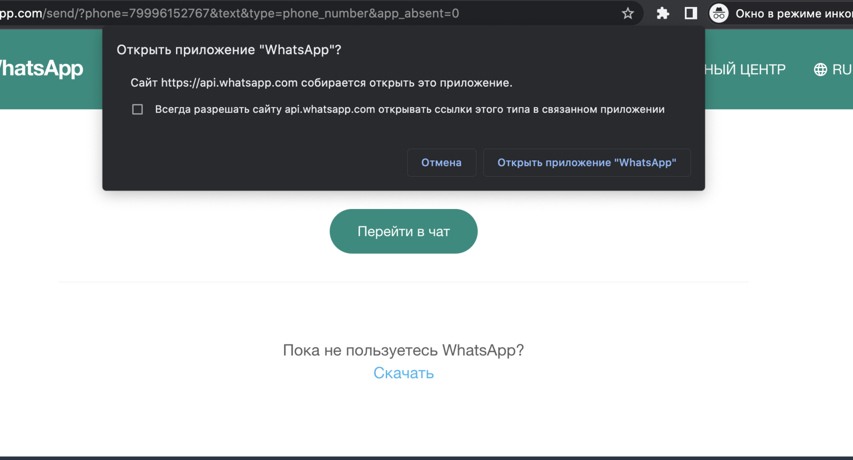 При клике на кнопку "Написать в WhatsApp Desktop" откроется окно в новой вкладке. В этой вкладке нужно нажать на кнопку "Открыть приложение WhatsApp"