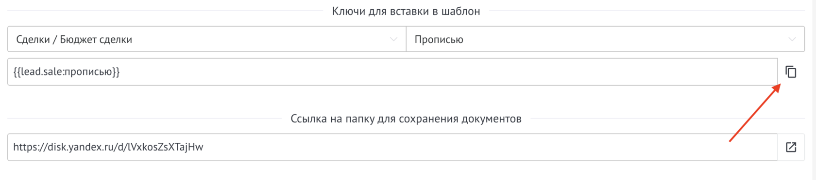 Внизу виджет отобразит ключ поля, например, бюджет сделки - {{lead.sale:прописью}} его необходимо скопировать, перейти в созданный шаблон и добавить этот ключ в текст шаблона